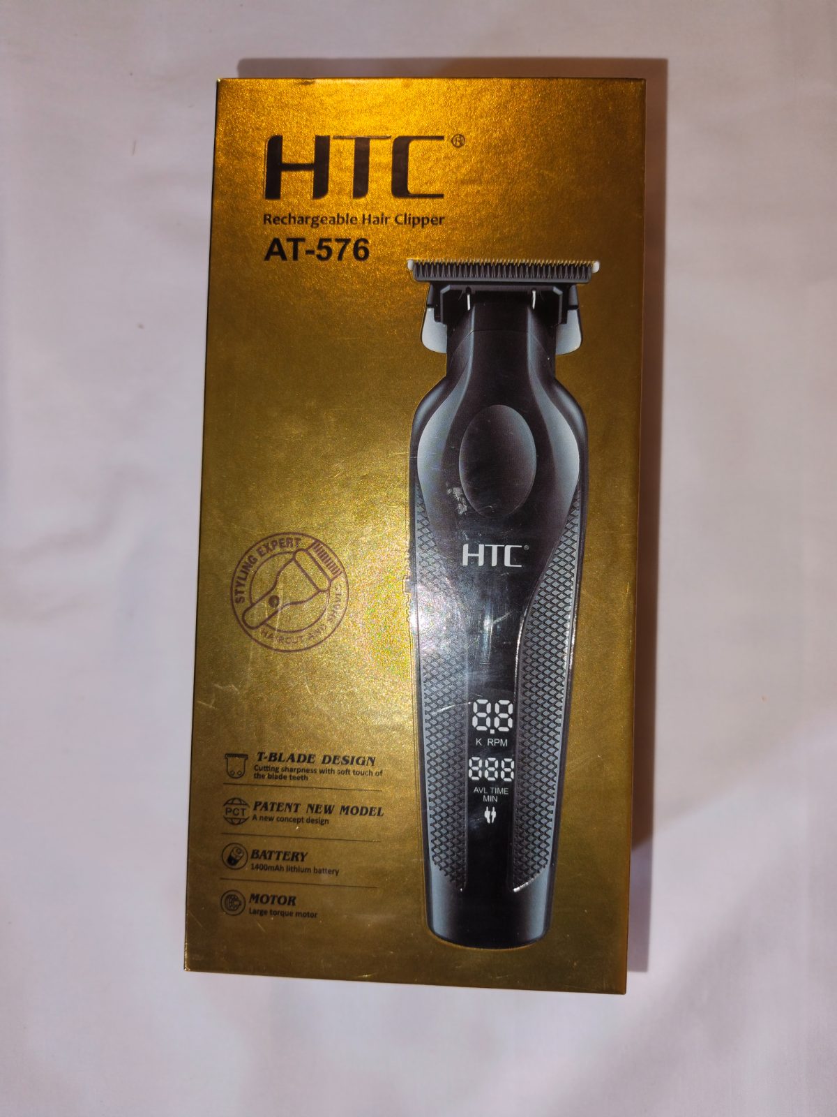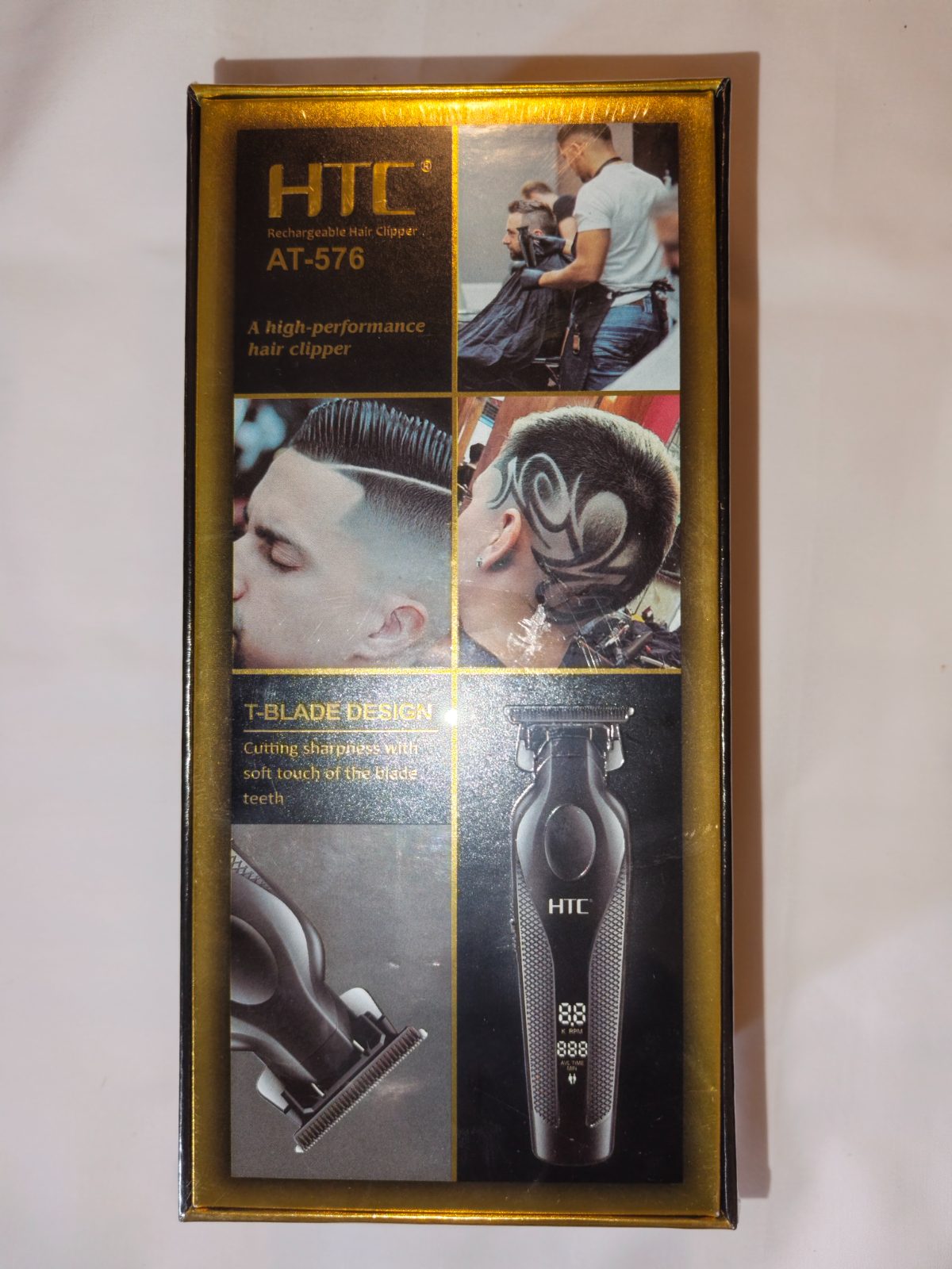 Tondeuse professionnelle haut de gamme HTC AT-576 avec écran LED numérique intégré. Lame T-Blade d’une précision chirurgicale pour des coupes parfaites. Batterie longue durée rechargeable. Design premium noir et or.